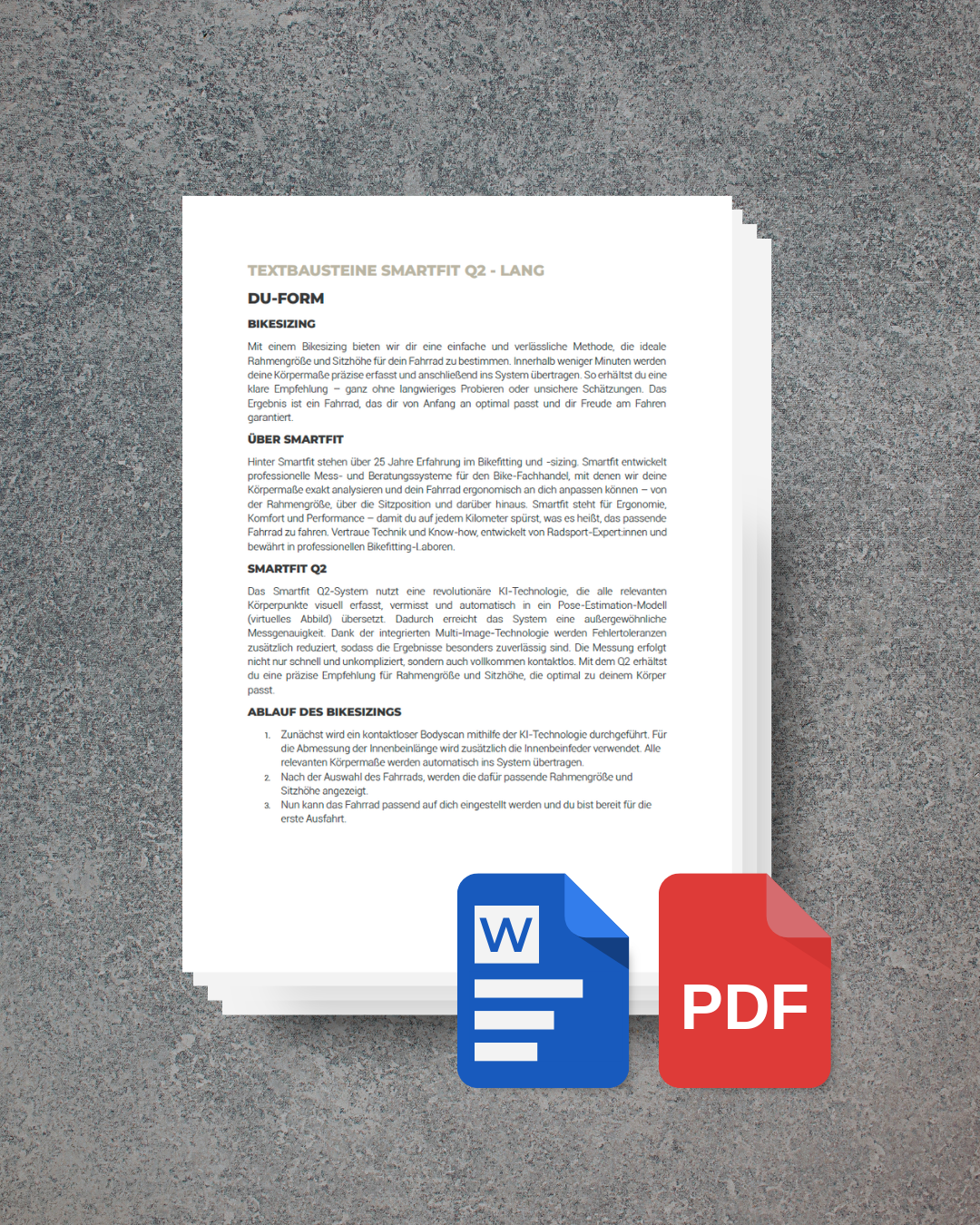 Für die Platzierung eures Bikesizing- und/oder Bikefitting-Services auf eurer Website wie auch In-Store und anderen Kanälen, könnt ihr euch die passenden Textbausteine herunterladen. Diese stehen euch im Word- wie auch PDF-Format zur Verfügung.